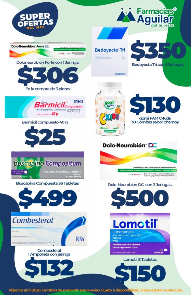 Farmacias Aguilar del sureste , excelente atención del personal, muy buenos precios en medicamentos genéricos y patentes.